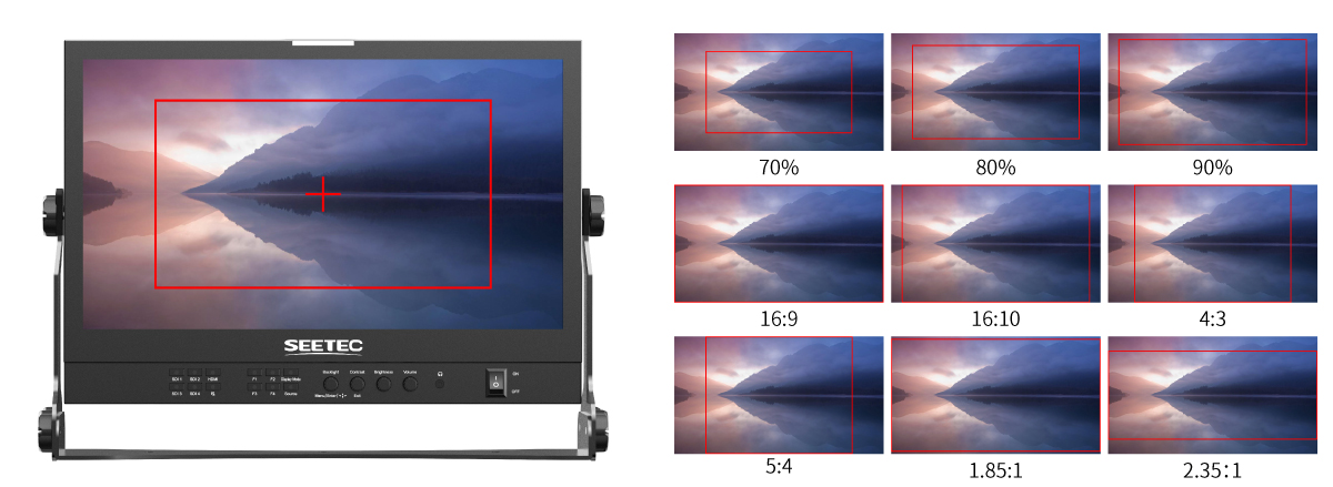 防止播放時(shí)掃描溢出,導(dǎo)致不該被切的畫面而被切掉。監(jiān)視器設(shè)有多種畫幅安全框標(biāo)記( 70%、80%、90%、16:9、16:10、4:3、5:4、1.85:1、2.35:1、自定義) 和拍攝標(biāo)記線和十字中心線。保障穩(wěn)定可靠的拍攝高效進(jìn)行,滿足多樣化的后期裁剪需求。用戶可以根據(jù)不同拍攝背景色調(diào)靈活選擇標(biāo)記線顏色(黃色、青色、紫色、紅色, 綠色, 藍(lán)色, 黑色, 白色)。